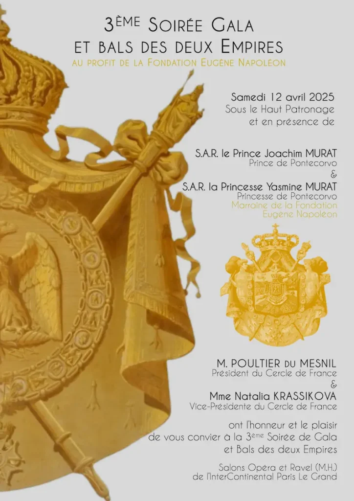 Sous le Haut Patronage de S.A.R le Prince Joachim MURAT et S.A.R la Princesse Yasmine MURAT, Marraine de la Fondation Eugène Napoléon, Monsieur Laurent POULTIER DU MESNIL et Madame Natalia KRASSIKOVA, président et vice-présidente du Cercle de France, vous convient à la 3ème soirée de Gala et Bals des deux Empires, dans les salons de l’InterContinental Paris le Grand.